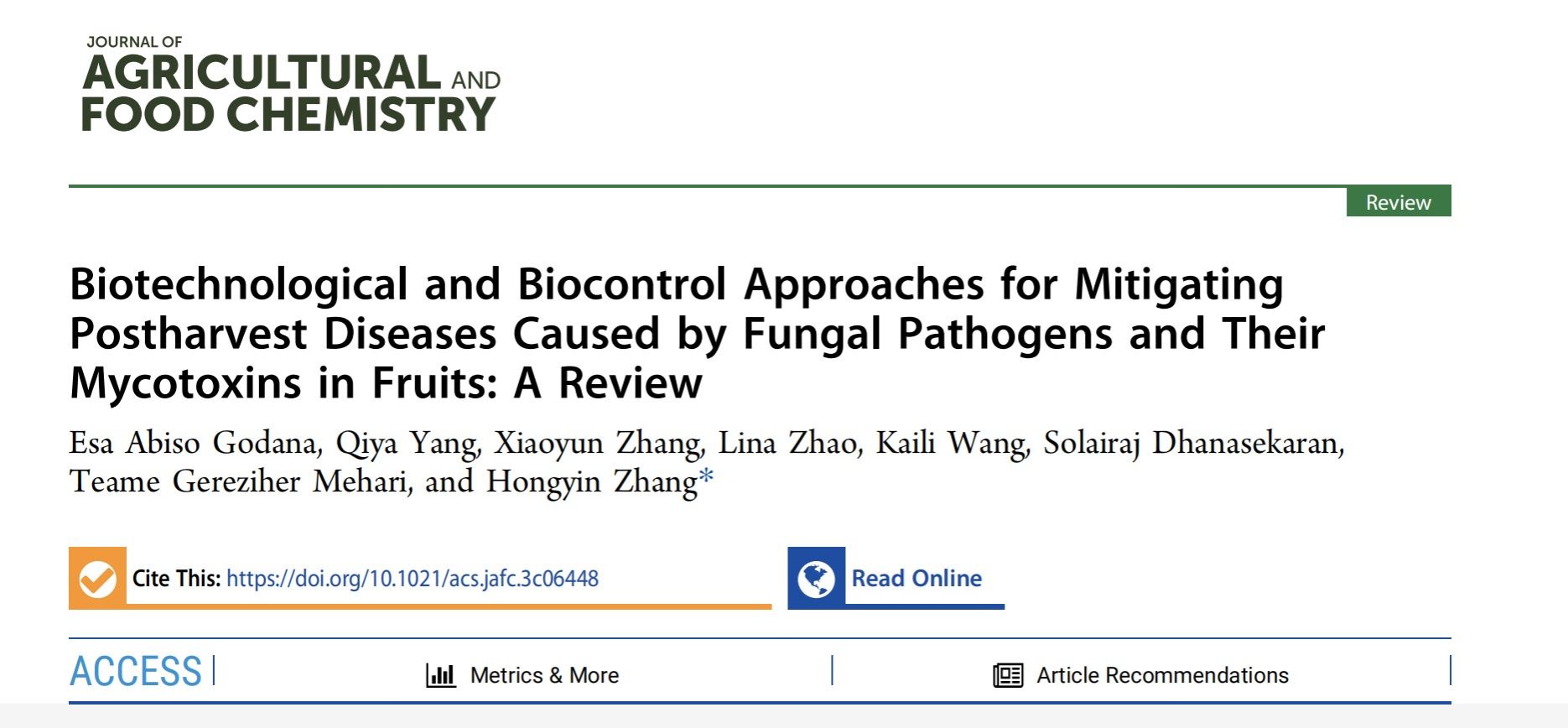 近日,bat365正版唯一官网张红印教授在Journal of Agricultural and Food Chemistry(中科院一区)发表题为“Biotechnological and Biocontrol Approaches for Mitigating Postharvest Diseases Caused by Fungal Pathogens and Their Mycotoxins in Fruits”的综述论文(https://doi.org/10.1021/acs.jafc.3c06448),系统阐述了拮抗性酵母菌、细菌和真菌等生防治剂在植物病害防治中应用的最新研究进展。江苏大学博士后Esa Abiso Godana为第一作者,张红印教授为本文的通讯作者。