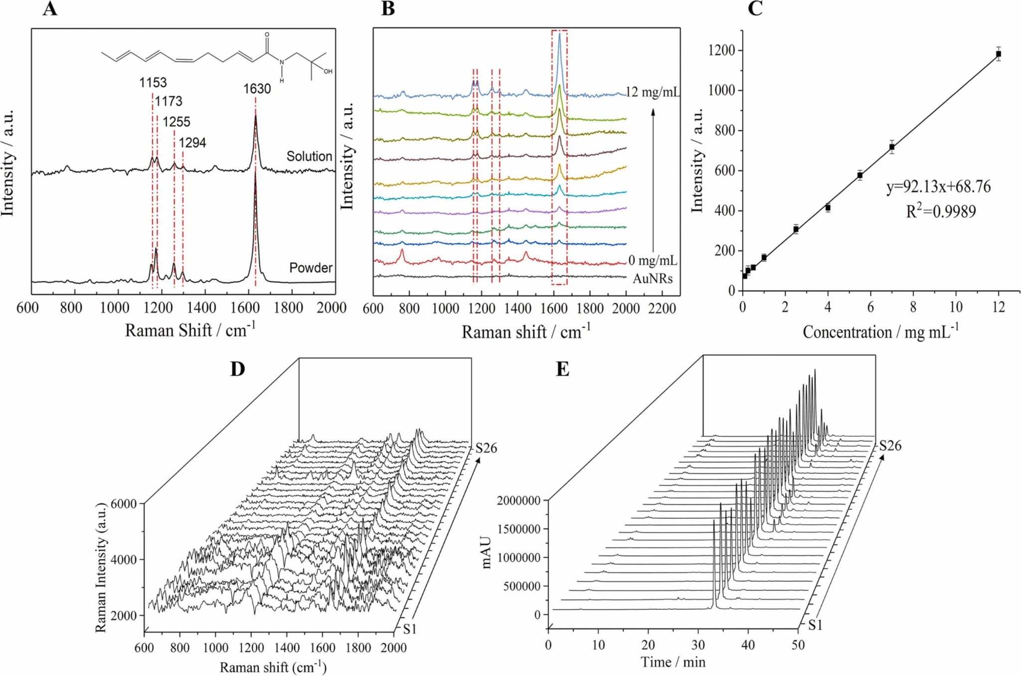 该研究利用便携式拉曼光谱仪及制备的AuNRs基底采集α-SOH标准品的D-SERS光谱,并根据主要特征峰强度和α-SOH浓度建立α-SOH标准曲线,凭借线性关系、检测限、相对标准偏差等方面的考察,表明该方法具有良好的重现性和稳定性(图1)。