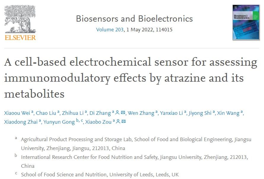 近日,bat365正版唯一官网邹小波教授课题组在Biosensors and Bioelectronics期刊上发表题为“A cell-based electrochemical sensor for assessing immunomodulatory effects by atrazine and its metabolites”的研究论文(https://doi.org/10.1016/j.bios.2022.114015)。博士生魏晓鸥为论文的第一作者,张迪副教授和邹小波教授为共同通讯作者,文章作者还包括利兹大学宫芸芸教授.