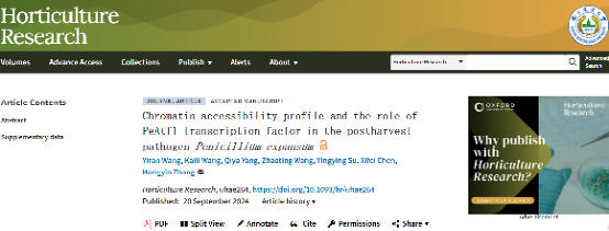 近日,我校bat365正版唯一官网张红印教授团队在植物学领域Top期刊《Horticulture Research》上在线发表论文“Chromatin accessibility profile and the role of PeAtf1 transcription factor in the postharvest pathogen Penicillium expansum”。bat365正版唯一官网博士研究生王祎然为第一作者,张红印教授为通讯作者。