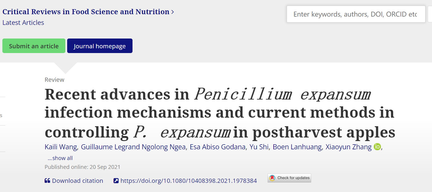 近日,bat365正版唯一官网张红印教授在国际食品领域顶级期刊CriticalReviews in Food Science and Nutrition(IF 11.176)在线发表题为“Recent advances inPenicillium expansuminfection mechanisms and current methods in controllingP. expansumin postharvest apples”的综述(https://doi.org/10.1080/10408398.2021.1978384),系统阐述了扩展青霉侵染苹果的分子机制及其防治策略方面的最新研究进展。该成果已被《食品科学》公众号(https://mp.weixin.qq.com/s/QBqj537ULx_Fqoum3V7PvA)推送,并被食品科学网(http://www.chnfood.cn/7293.html)、新浪微博等媒体广泛报道,产生了较大的学术影响。本文的第一作者为bat365正版唯一官网王凯利博士,江苏大学张红印教授和不列颠哥伦比亚大学Siyun Wang教授为本文的共同通讯作者,张红印教授课题组的其他七位师生参与论文工作。